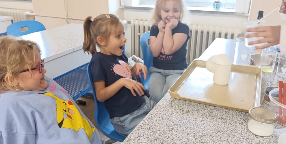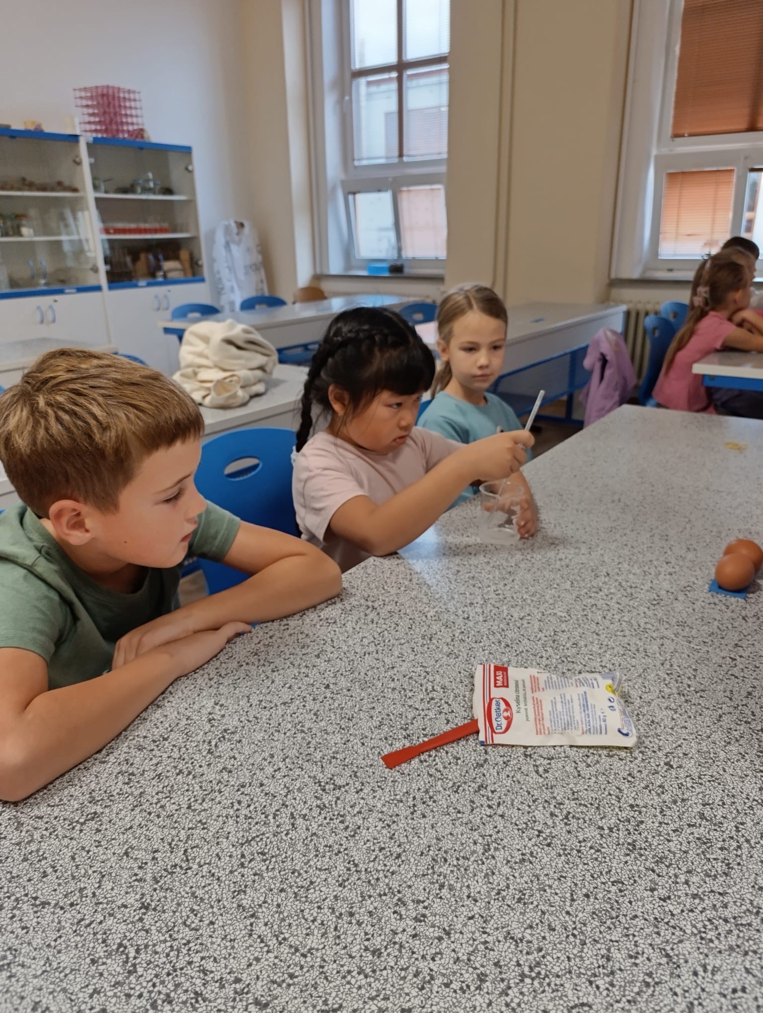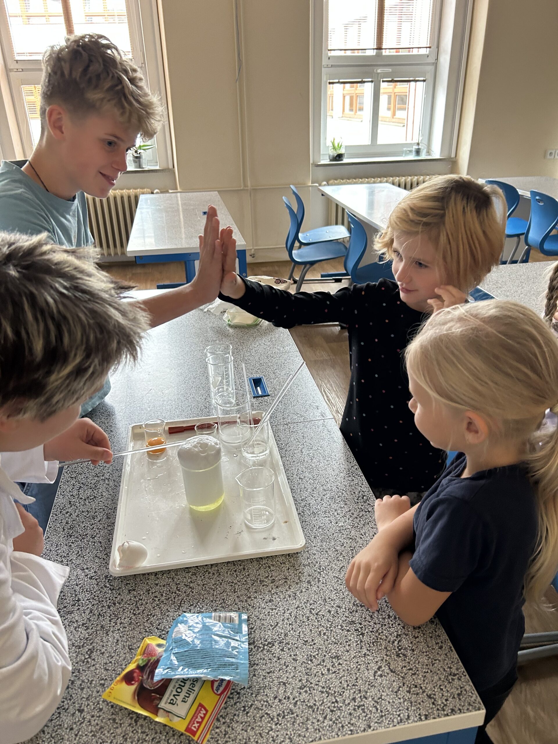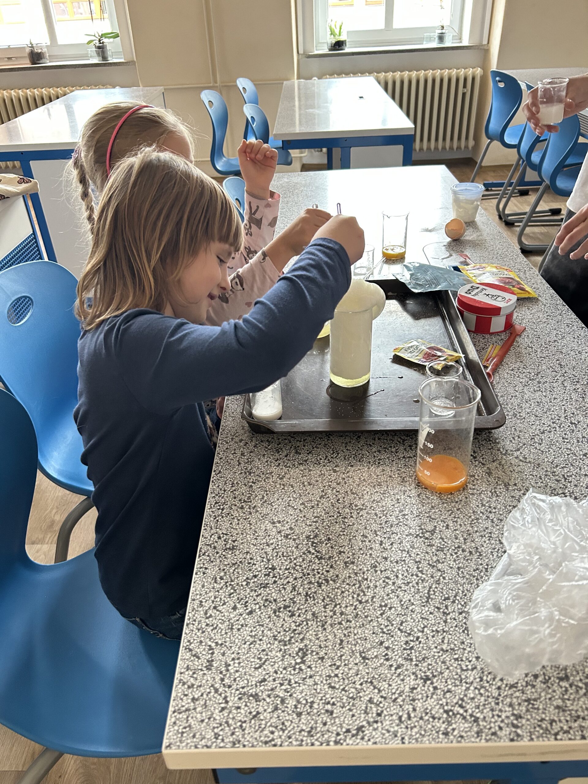Děti z 2. a 3. oddělení školní družiny s radostí přijaly pozvání na hodinu chemie. Malí vědci se tak na chvilku mohli stát asistenty starších žáků. Pokus s názvem Barevná sopka je natolik uchvátil, že svoje ,, starší kolegy “ odměnili potleskem.
