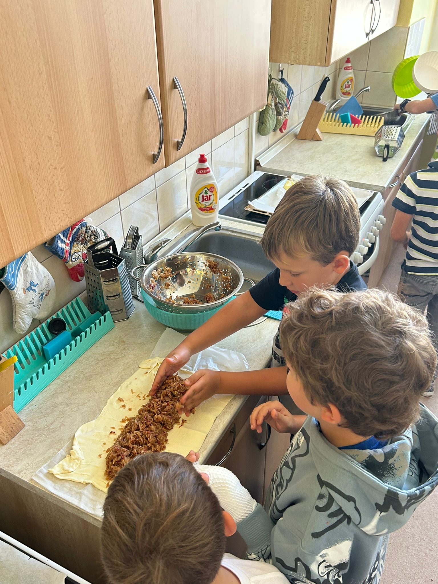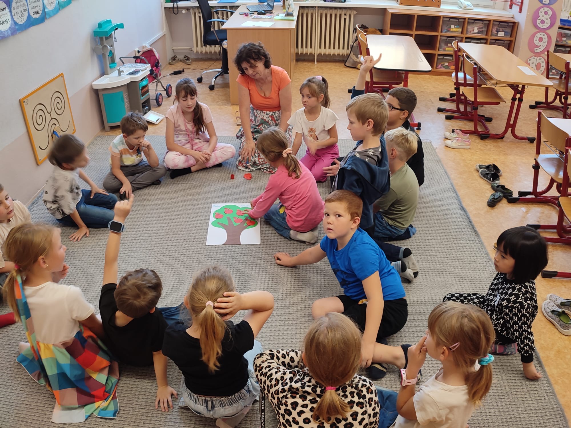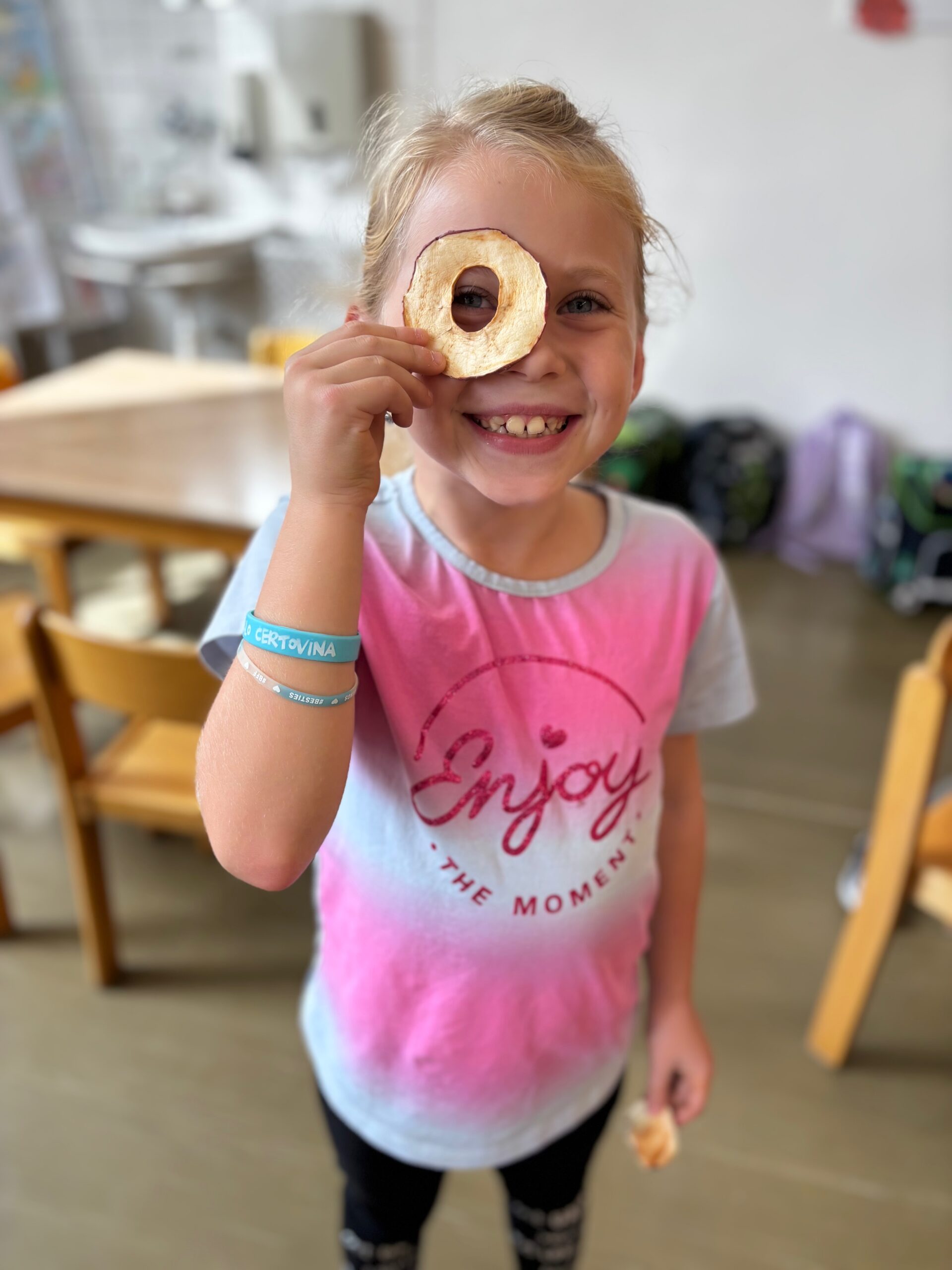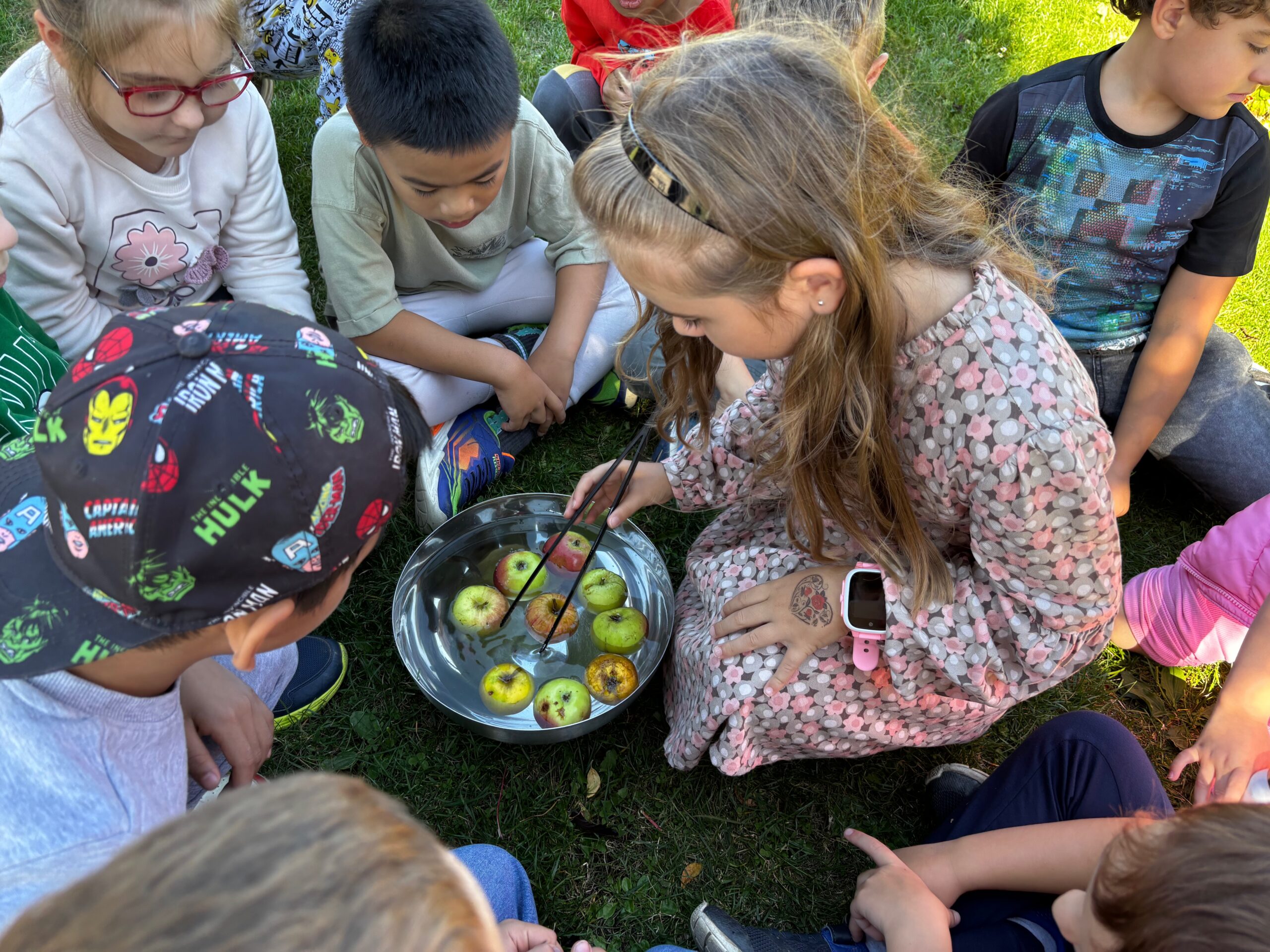 Páteční slavnostní zakončení projektu patřilo společnému tanci – na chodbě školní družiny si všechna oddělení společně zatančila Mazurku na známou píseň ,,Měla babka čtyři jabka“. Velkým zážitkem bylo také tvoření na školní zahradě, kde děti společně vytvořily obrovský tvar jablka – symbol celého týdne.