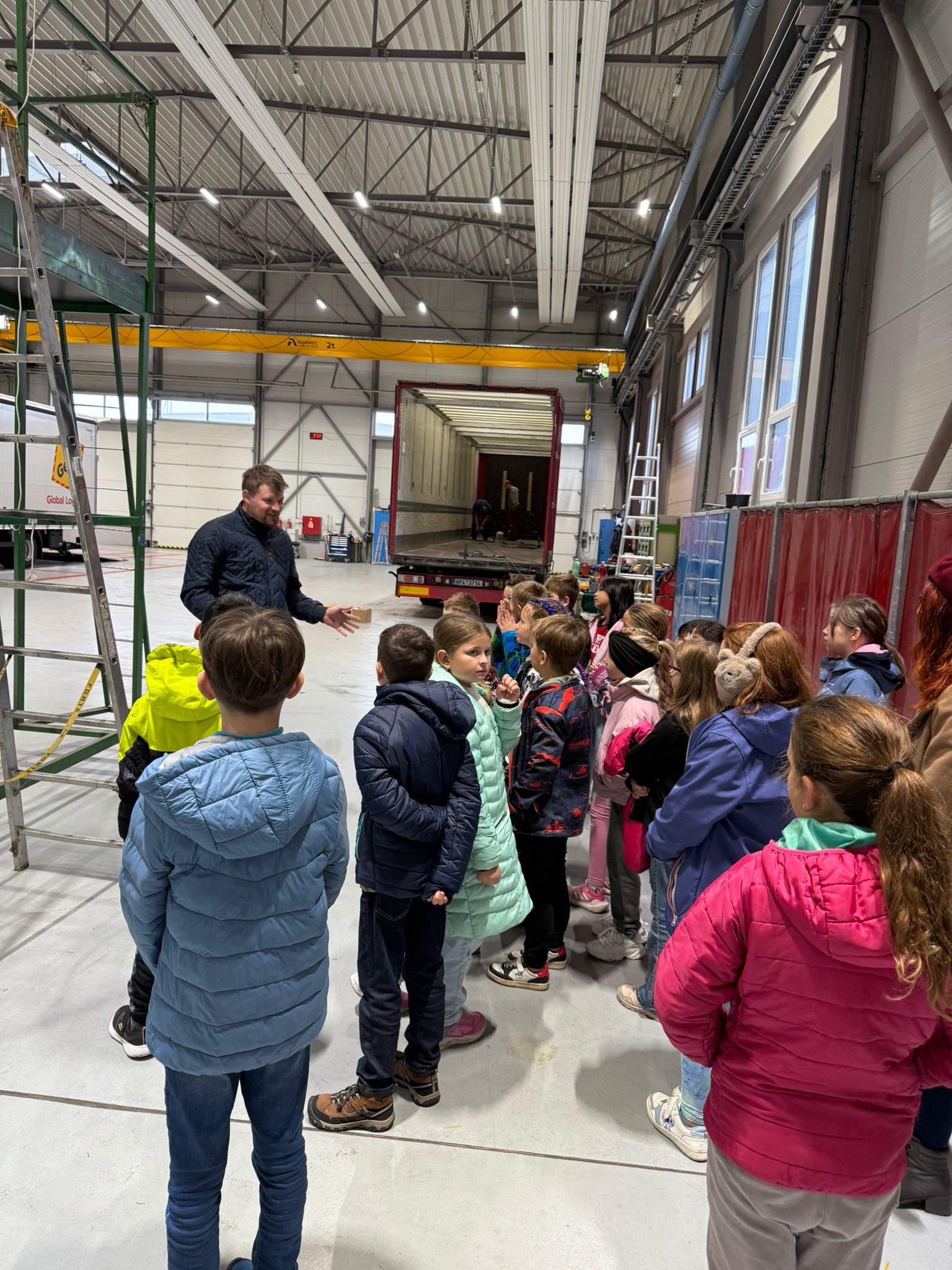 Hned po příjezdu nás přivítaly usměvavé průvodkyně – naše žákyně Maruška se svojí maminkou a mladší sestřičkou. Doprovodily nás přímo do areálu firmy, kde nám ukázaly, jak se takové auto vyrábí. Bylo to jako velká skládačka, kde se z malých dílků rodí obří náklaďáky. Největší dojem na nás udělala obrovská hala s auty, do kterých si mohl každý sednout a vyzkoušet si například zapnout blikání nebo snížit volant.